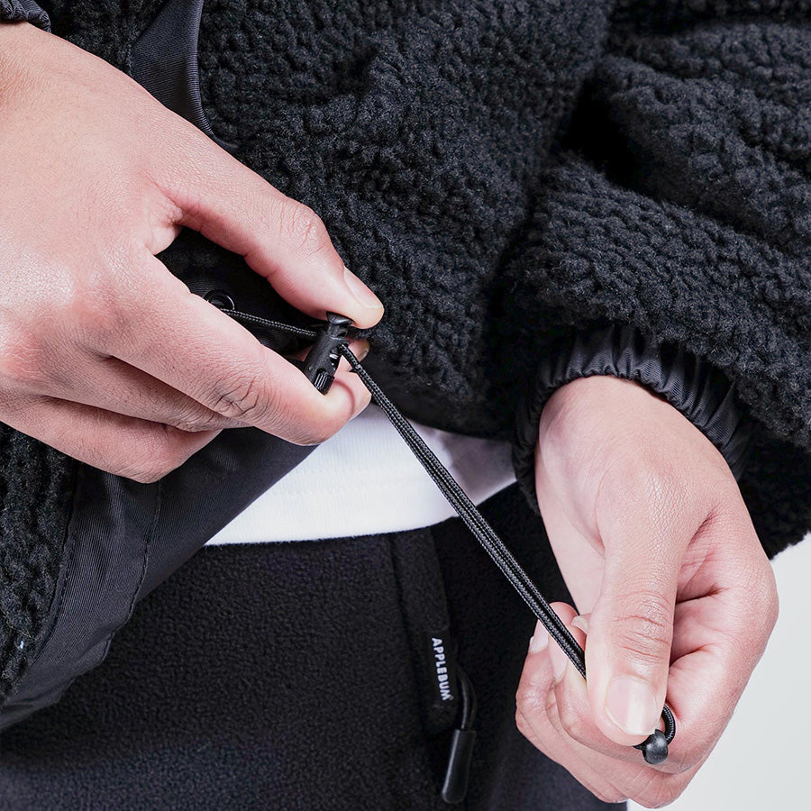 表面にはふんわりとしたボアフリース素材、裏面にはマットな質感のポリエステルツイル地を採用。
