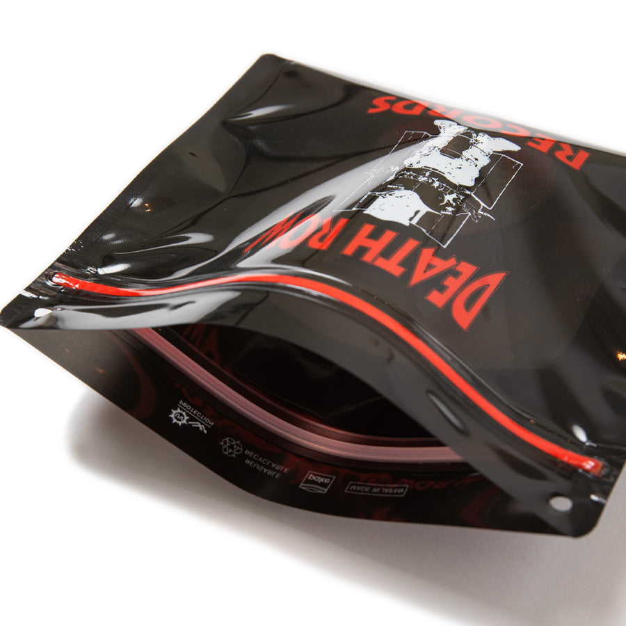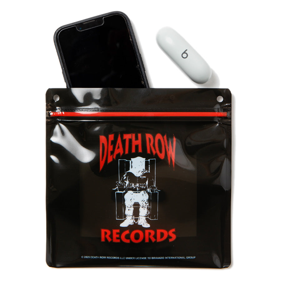 1990年代ウエストコースト・ヒップホップの象徴的レーベル、Death Row Records (デス・ロウ・レコード)のロゴを大胆にプリントしたパケ。