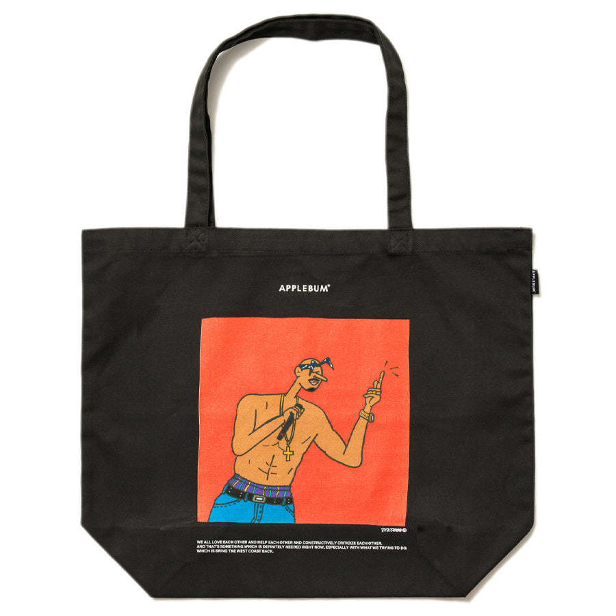 1996年に25歳の若さでこの世を去った西海岸を代表する伝説的ラッパーのコンサートでのワンシーンをバックに落とし込んだトートバッグ。