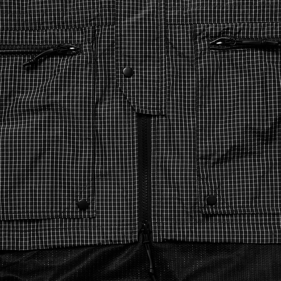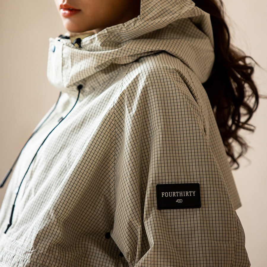 ワイドながらもショート丈のマウンテンパーカーの復刻版です。今季はリップストップ調の格子柄チェック素材を使用し、春らしい軽いイメージを持つ仕上がりです。ラグラン仕様のアーム部分は立体的な裁断で動きを妨げないデザインです。