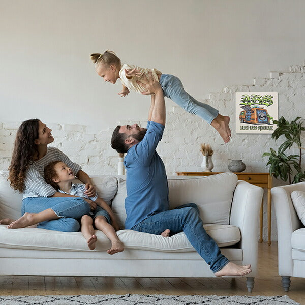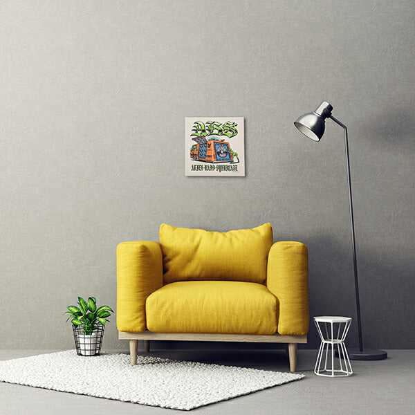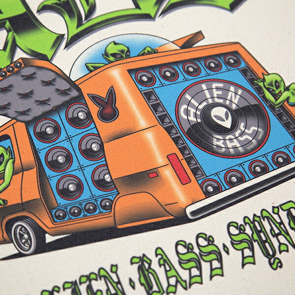 サウンドシステムを搭載したバンにエイリアンのサウンドクルーという、TEXTA氏の独特のクリエイティビティが生み出すアートワークは必見。しっかりとした木枠に、キャンバス生地を貼り付けた仕様になっています。