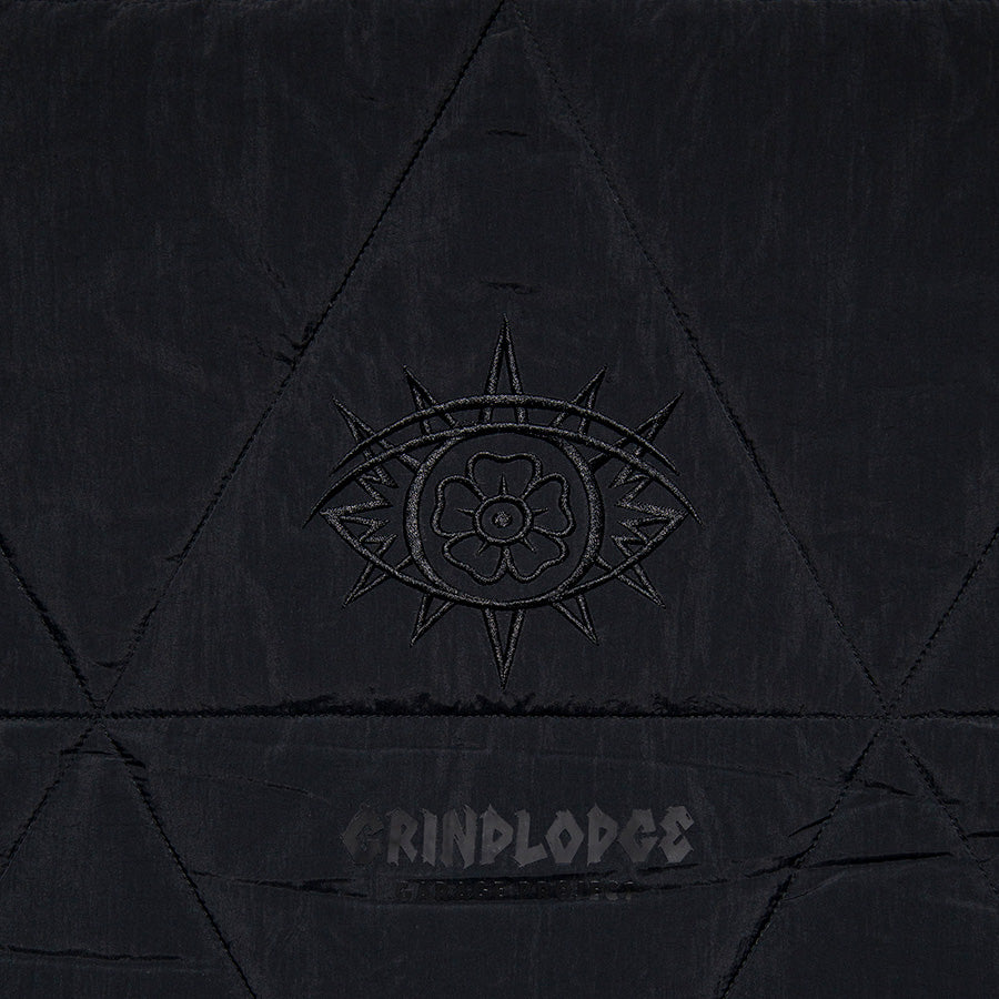 バックスタイルの中央に配された三角形には、GRINDLODGEのアイコンである“目”の刺繍をデザイン。左胸には両ブランドのコラボロゴ刺繍、さらに背面のロゴには同色の立体プリントを採用し、抑えたトーンの中にも存在感を漂わせています。