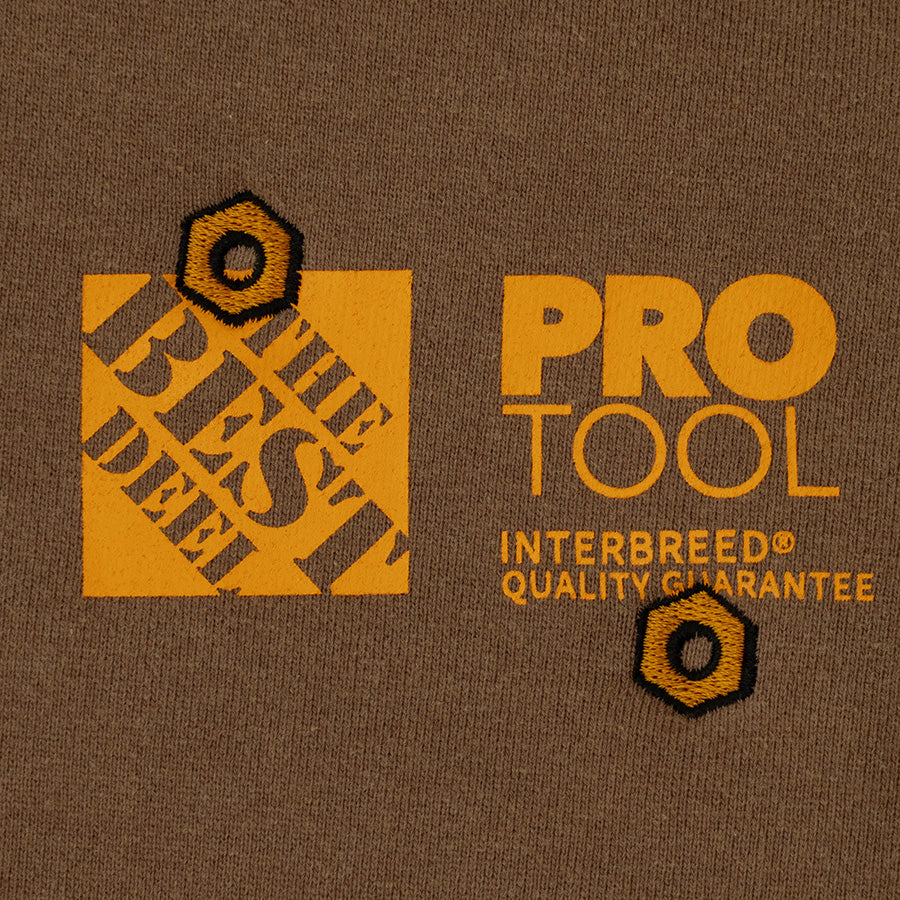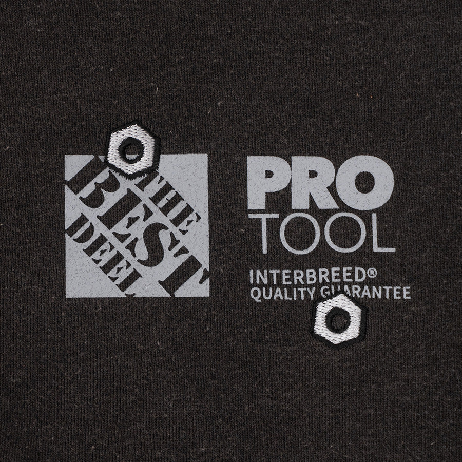 胸には“Work”をテーマにしたロゴをシルクプリントで配置し、その上にナット刺繍を重ねることで、ホームセンターのユニフォームをコンセプトにした独自の世界観を体現。細部のディテールと加工技術が相まって、リアリティと存在感を兼ね備えた一枚に仕上がっています。