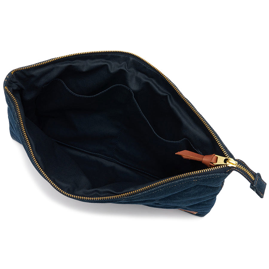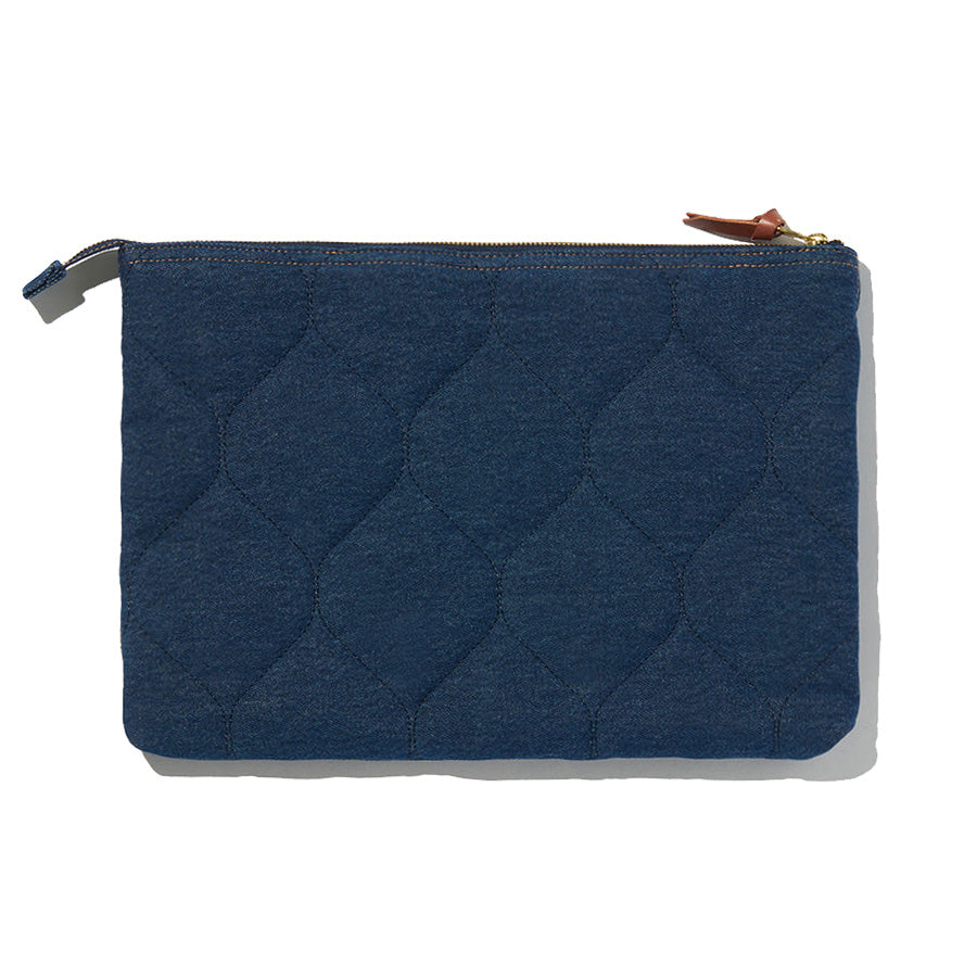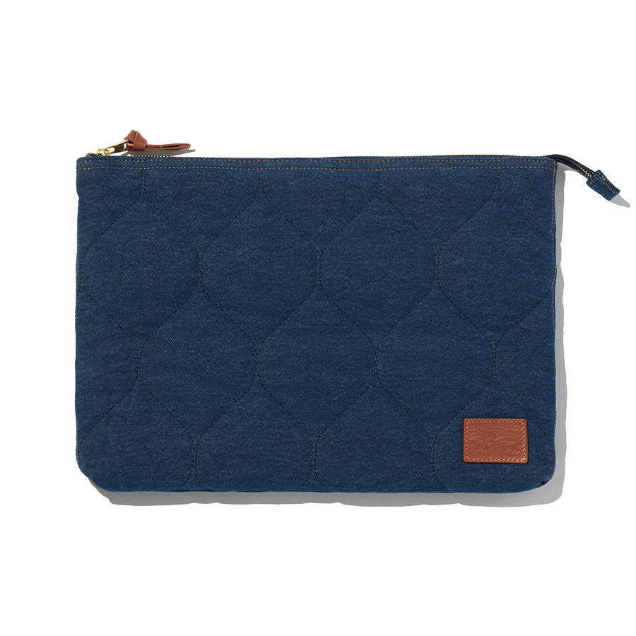 ノートパソコンやタブレットの持ち運びに最適なサイズ感で、クラシックなブルーデニムに加え、ブランドの象徴であるレザーパッチやレザープラーなど、高級感のあるディテールが魅力です。